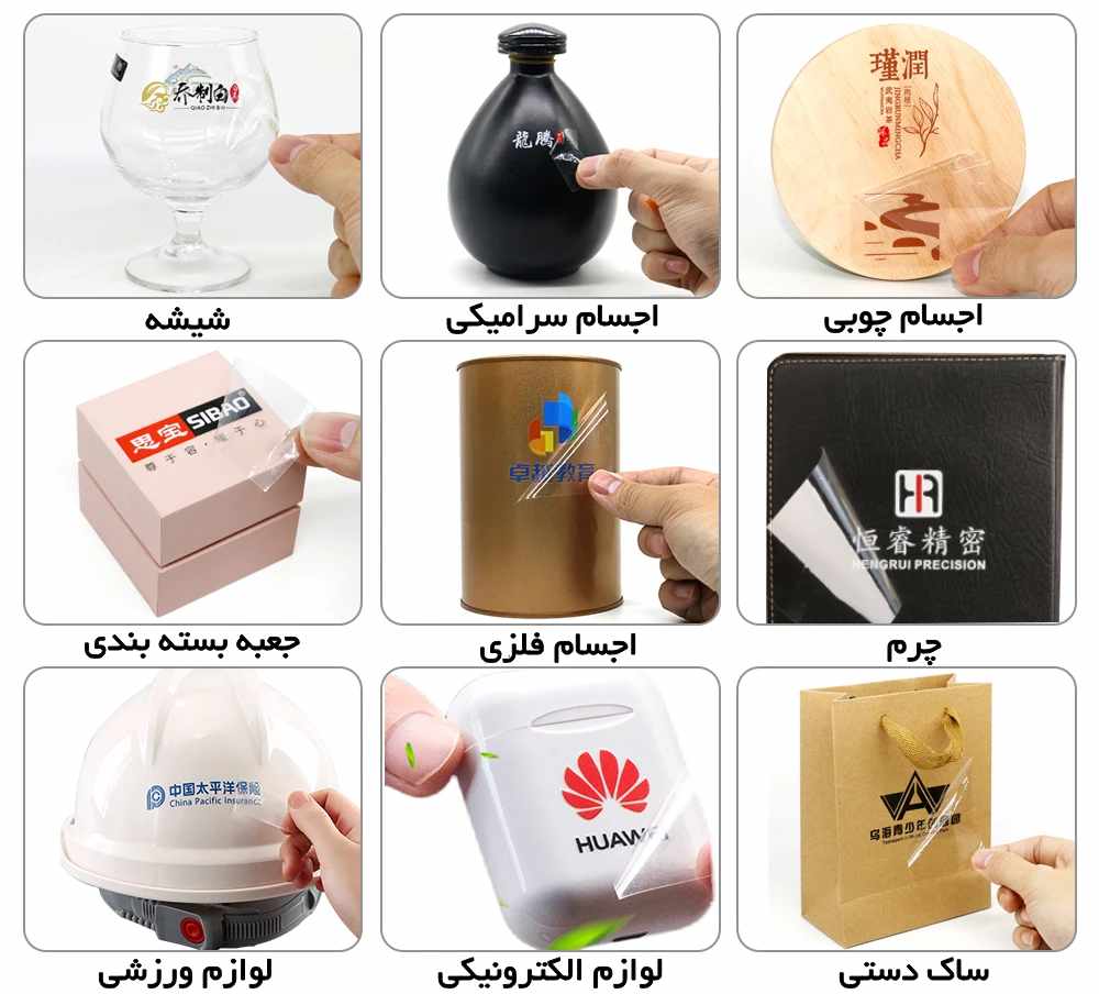 چاپ UV DTF توسط دستگاه چاپ پیشرفته ای انجام می شود که می توانید توسط آن روی انواع مختلف متریال مانند سرامیک، چوب، شیشه، پلاستیک، چرم، فلز و … با انواع سطح صاف و منحنی چاپ غیر مستقیم انجام دهید. در این شیوه چاپی، ابتدا چاپی با کیفیت روی لایه فیلمی بسیار ظریف و پشت چسبدار انجام می شود .سپس فیلم نازک دیگری بر روی سطح چاپی قرار گرفته و مانند سلفون روی آن نصب می شود، در انتها کار چاپی بر روی فیلم دوم قرار میگیرد. سپس برای انتقال چاپ، طرح را با قیچی برش داده لایه پشتی آن را جدا می کنید و روی سطح مورد نظر می چسبانید، برچسب را به خوبی روی سطح فشار داده و پس از چند ثانیه لایه سلفونی رویی آن را جدا کنید. نتیجه نهایی کار بسیار زیبا و مقاوم بوده و مانند چاپ برجسته روی سطح مورد نظر شما می شود.